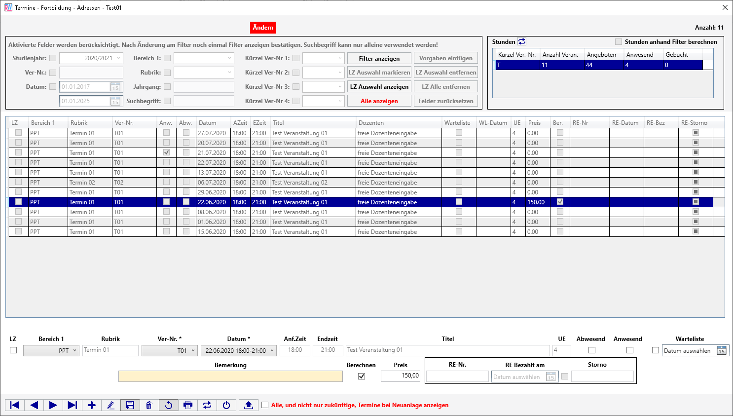 die ein T in der Veranstaltungsnummer enthalten. Standardmäßig wird über alle Termine die Stunden Information angezeigt, Sie haben die Wahl Stunden anhand Filter berechnen zu aktivieren,
