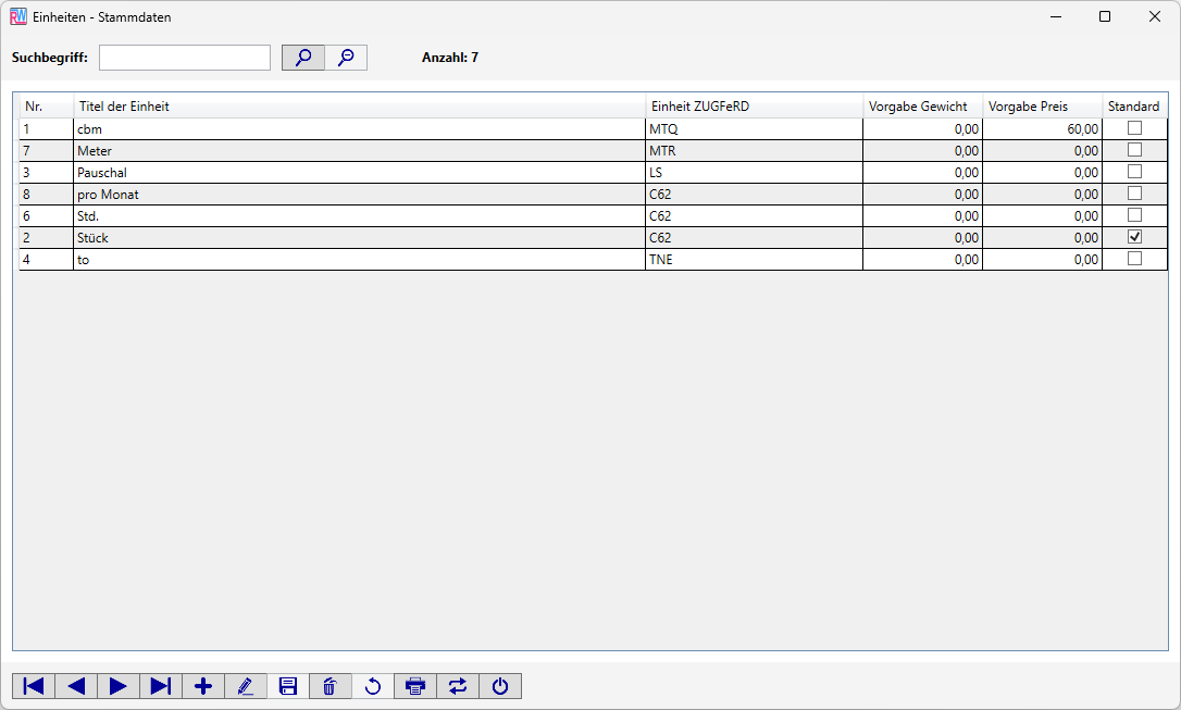 Hier können Sie die Einheiten verwalten, die bei Artikeln hinterlegt werden müssen.